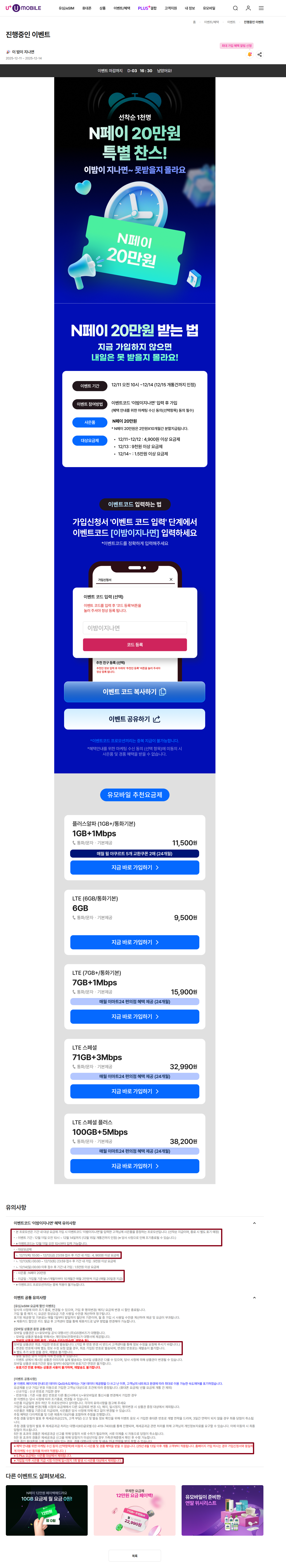 유모바일 네이버페이 20만원 이벤트